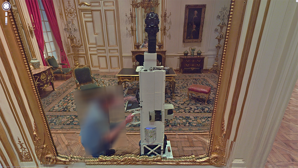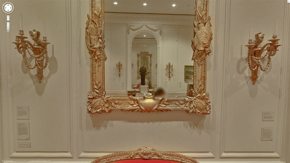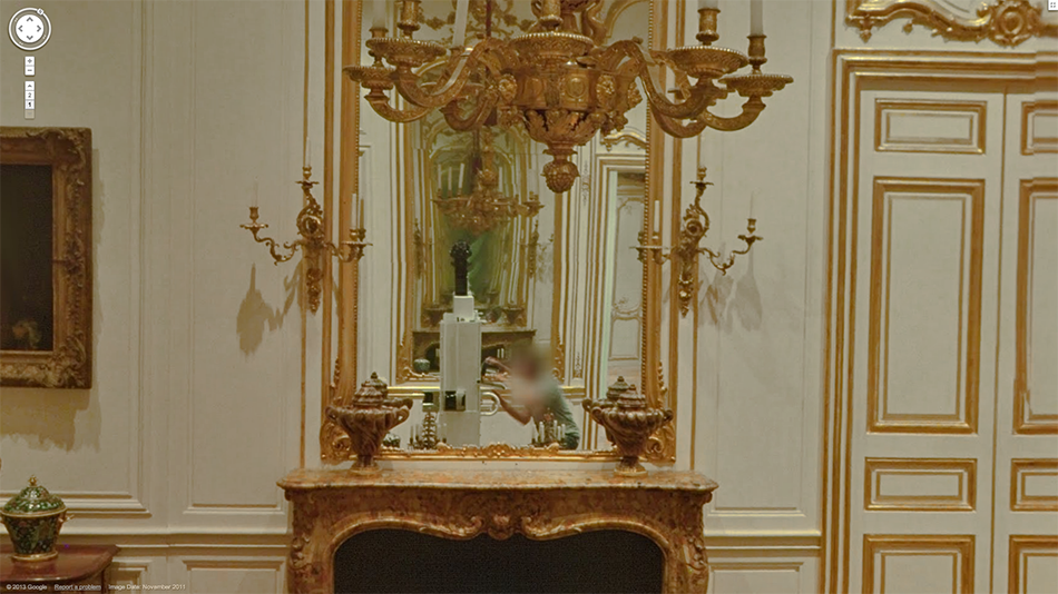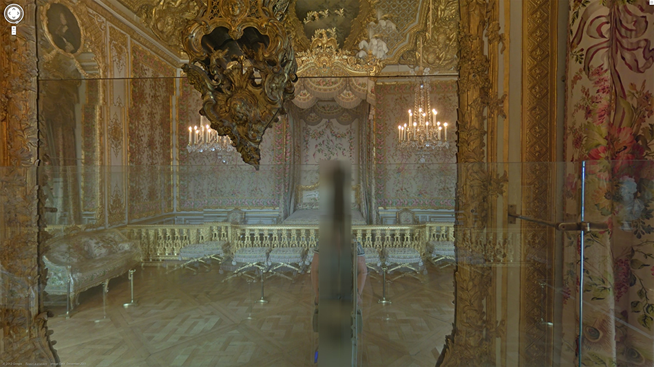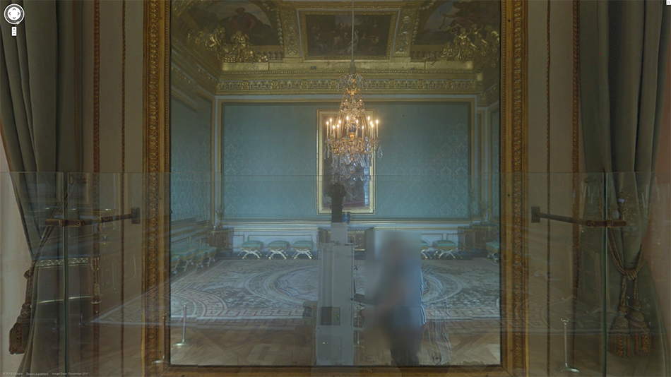 Mirrors Behind the Curtain reveals the self-censored workings of this all-seeing, all-knowing medium. The screenshots in this series are rare glimpses of Google’s elusive "Street View" camera, busy at work, virtualizing the interiors of different museums, castles, and institutions of power around the world. Unlike normal street view though, in which Google’s car and camera have been easily masked out, the museums’ and castles’ plethora of mirrors present a situation where Google cannot cover its tracks. These images are ambivalent portraits of the often invisible, panoptic power of Google’s observation.